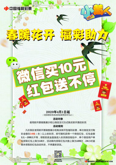 值此春暖花开之际,福利彩票“刮刮乐”带着“百万”红包来啦!2020年4月1日起,通过福彩即开票销售展示柜(即福彩“小黄人”)平台,使用190万元营销资金开展“春暖花开 福彩助力”主题促销活动。